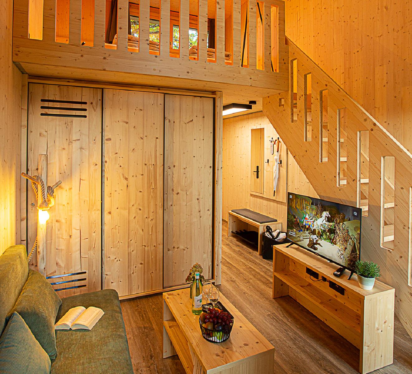 Die Baumhäuser verfügen über Smart-TV, Pflegeprodukte, Dusche, WC und Balkon. Die Baumhäuser bestehen aus einem Wohnschlafraum und einer Galerie. Auf der Galerie befindet sich ein Doppelbett, im Wohnschlafraum steht ein Doppelschlafsofa zur Verfügung.