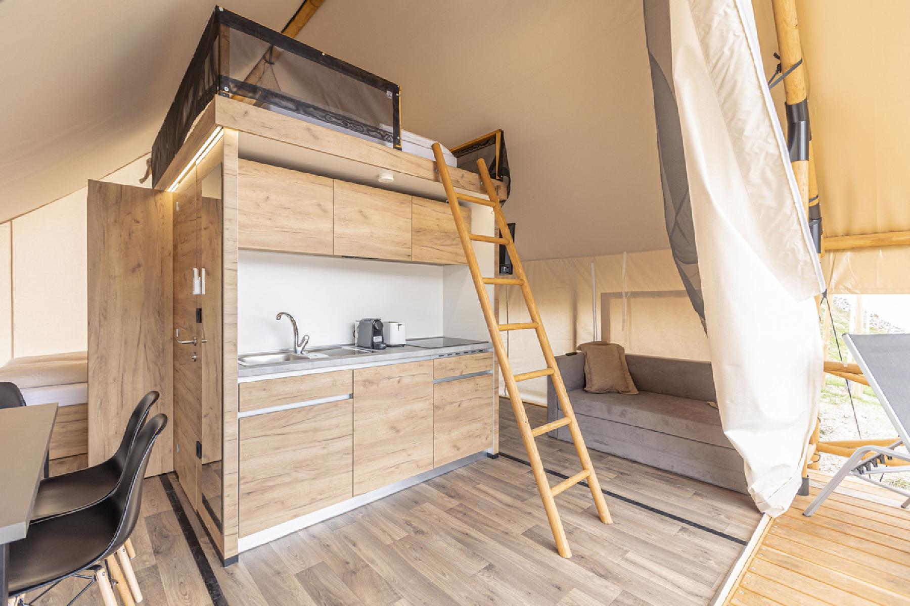 Die komfortablen Safari-Luxuszelte verfügen über eine Klimaanlage, Dusche, WC, Haartrockner und eine voll ausgestattete Küche (mit Besteck, Geschirr, Kochfeld, Mikrowelle, Kühlschrank mit Gefrierfach, Toaster, Wasserkocher und Kaffeemaschine). Die Zelte bestehen aus zwei Schlafräumen – ein Zimmer mit Doppelbett, das andere mit zwei Einzelbetten – sowie einem gemütlichen Wohnbereich. Die durchschnittliche Größe beträgt ca. 31 m².