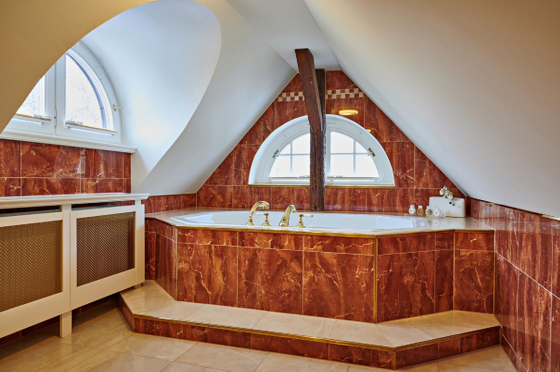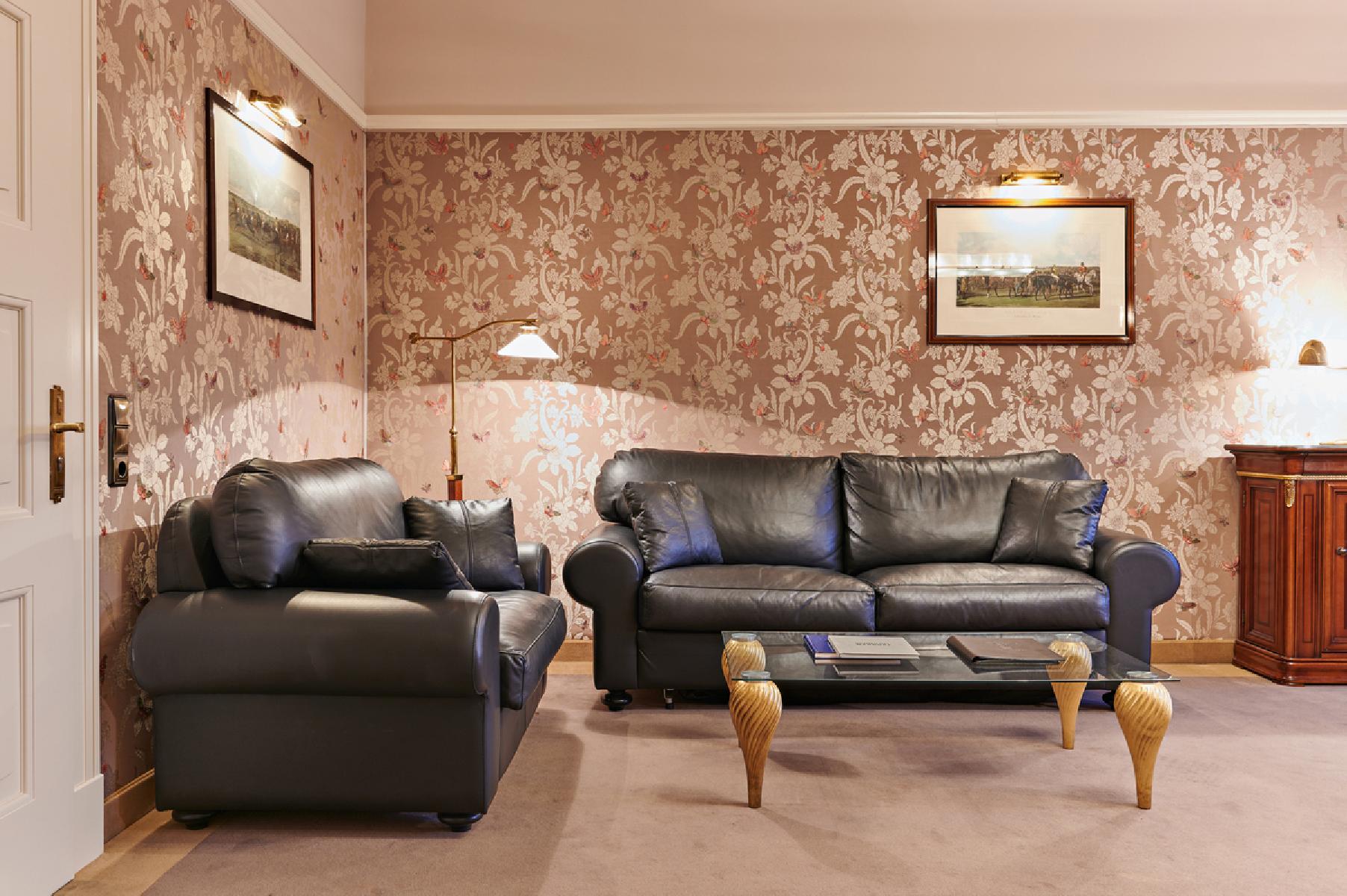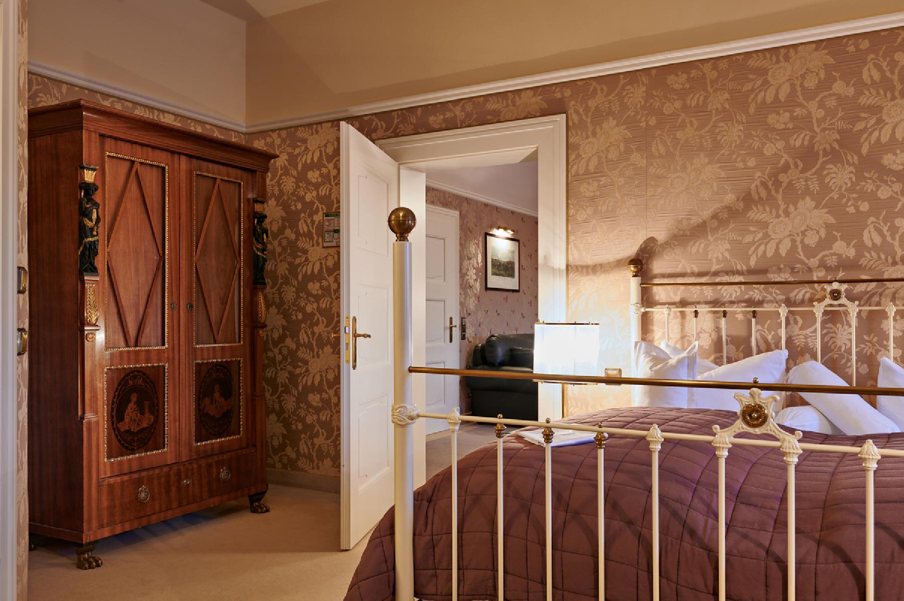 Die Suiten befinden sich im historischen Schloss und bieten ca. 75 m² Platz. Sie umfassen ein Schlafzimmer mit einem Doppelbett sowie einen Wohnschlafraum mit Doppelschlafsofa. Zur Ausstattung gehören eine Minibar, ein Schreibtisch ein und eine Badewanne oder eine Dusche, WC mit Föhn und Kosmetikspiegel sowie ein Bademantel. Genießen Sie den Gartenblick während Sie Ihren Kaffee oder Tee zubereiten. Zur weiteren Ausstattung gehört ein Flachbild-TV.