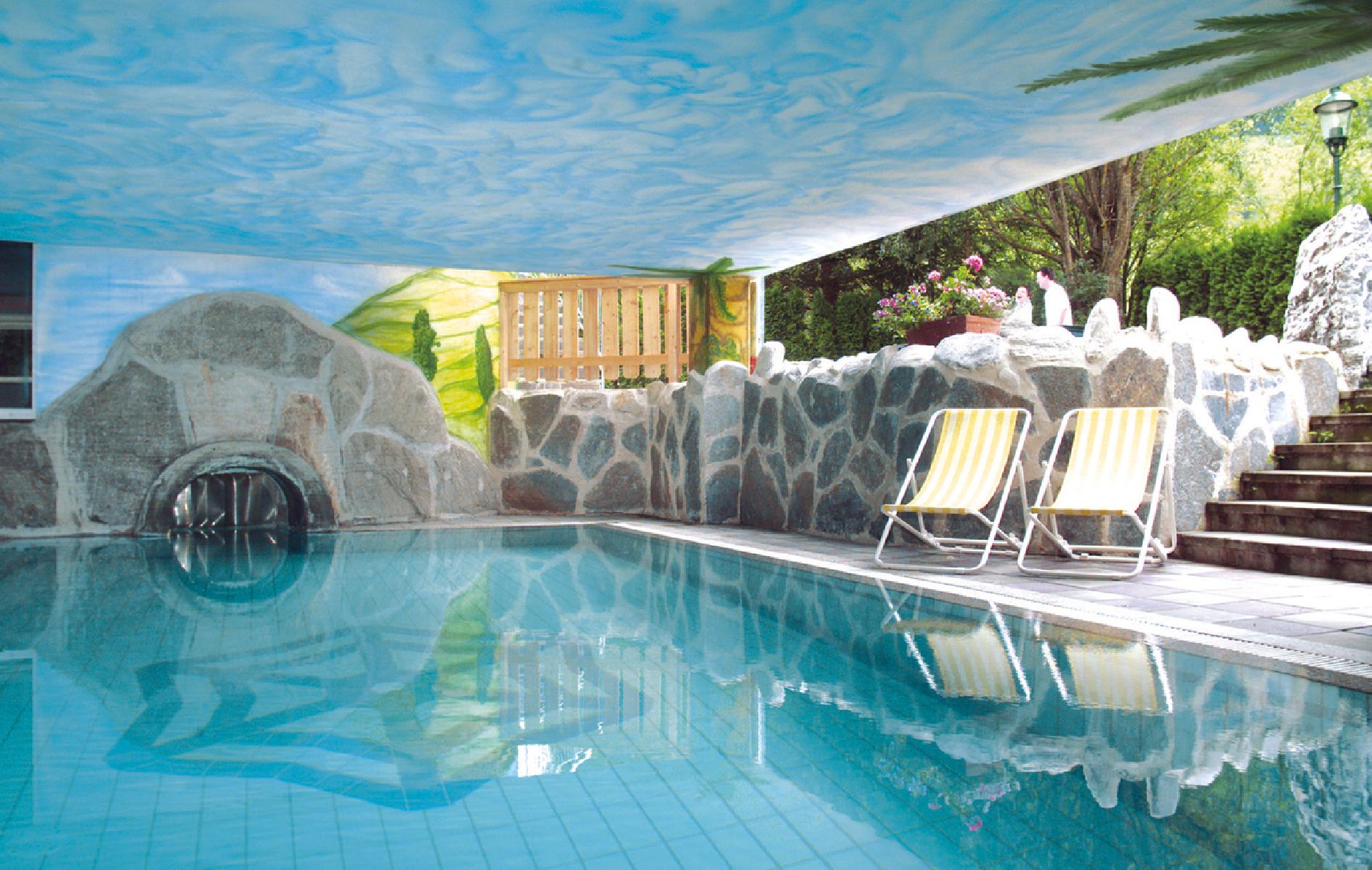- Innenpool (ca. 72 m²) mit Massagedüsen und beheizter Außenpool (nur ab 10°C oder mehr geöffnet), Innen- u. Außenpool sind miteinander verbunden