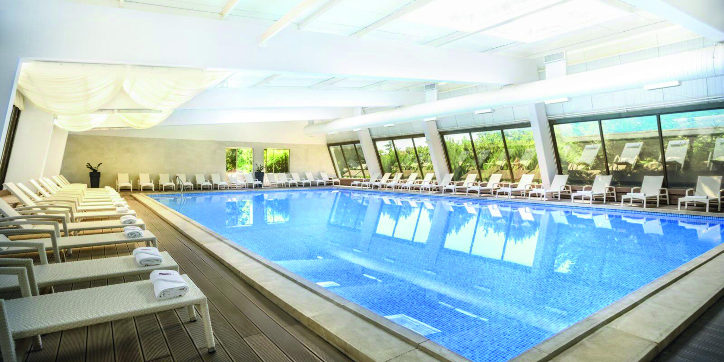 - Innenpool mit beheiztem Meerwasser (10 m x 17 m, Wassertemperatur ca. 29 °C)