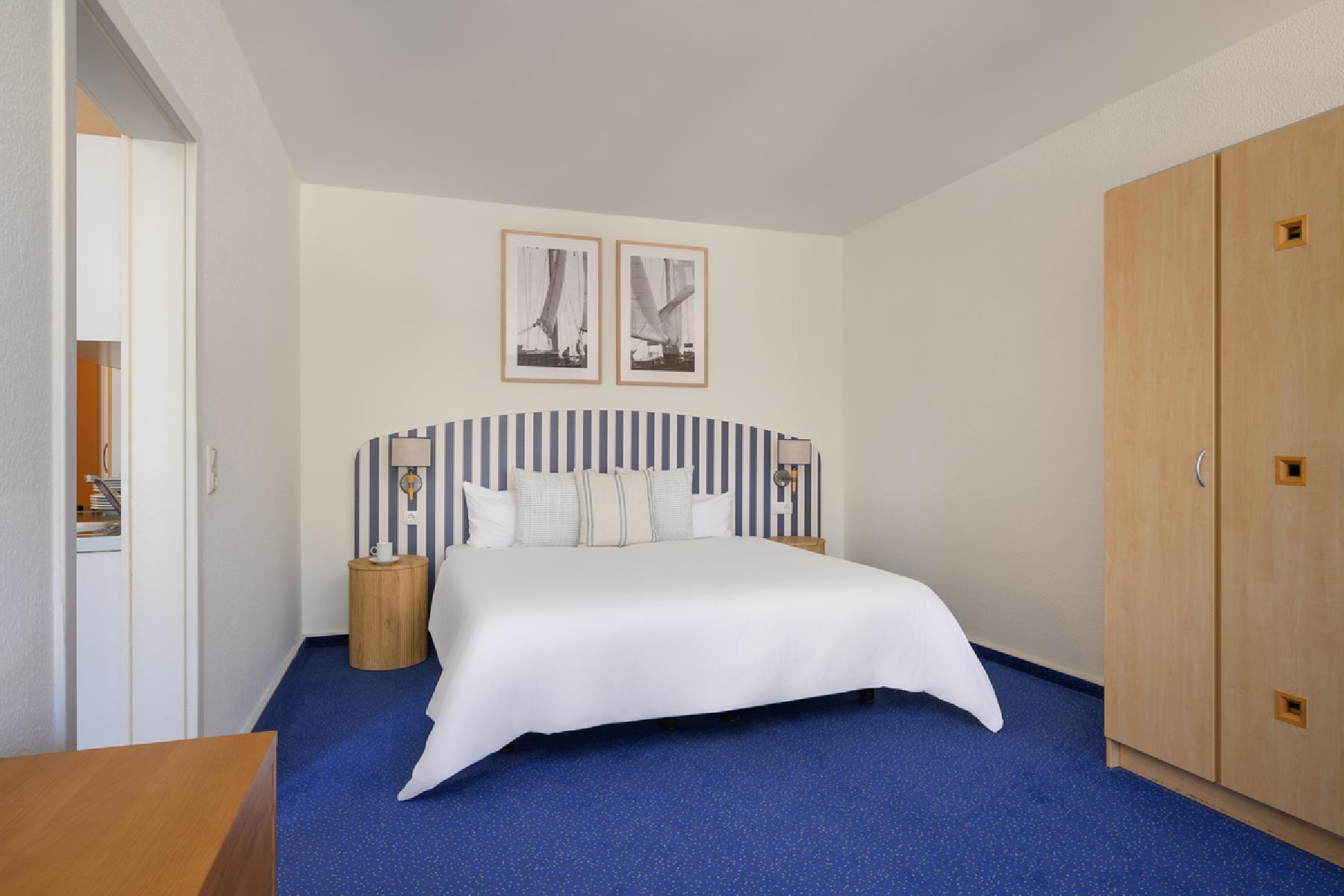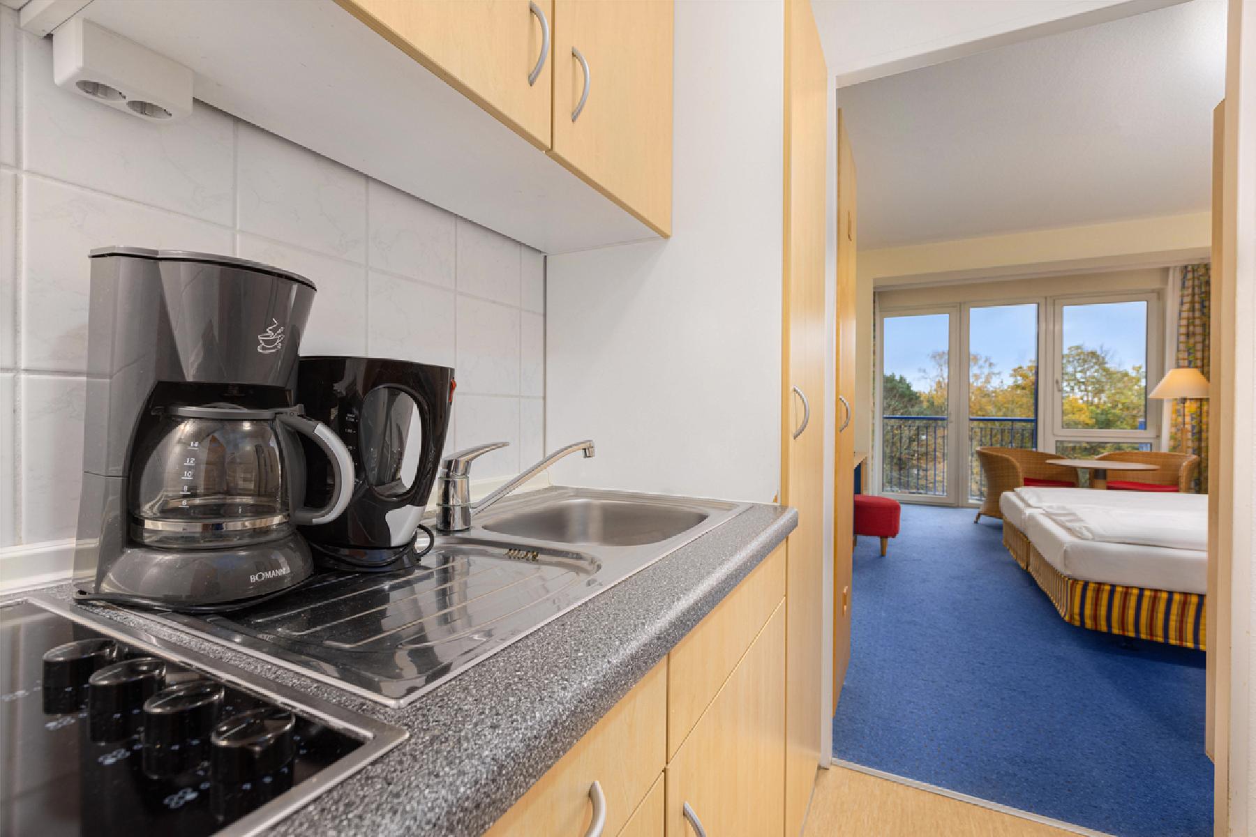 Die Zimmer verfügen über SAT-TV, integrierte Küchenzeile (Kühlschrank, Kaffeemaschine, Wasserkocher, Toaster und Cerankochfeld), Dusche/WC und einen Balkon. Die Zimmer bestehen aus einem Schlafraum mit einem Doppelbett und einem Schlafsofa. Die durchschnittliche Zimmergröße beträgt ca. 24 - 29 m².