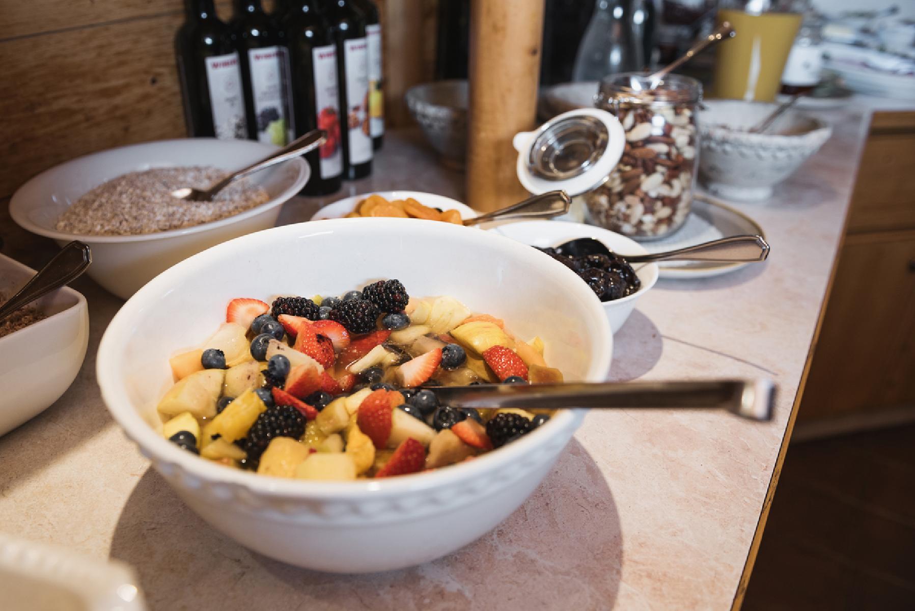 * natürliches Vitales Frühstücksbuffet mit Produkten aus der Region und hausgemachten Produkten wie Marmeladen, Bircher Müsli, Honig; Frische Eierspeisen aus der