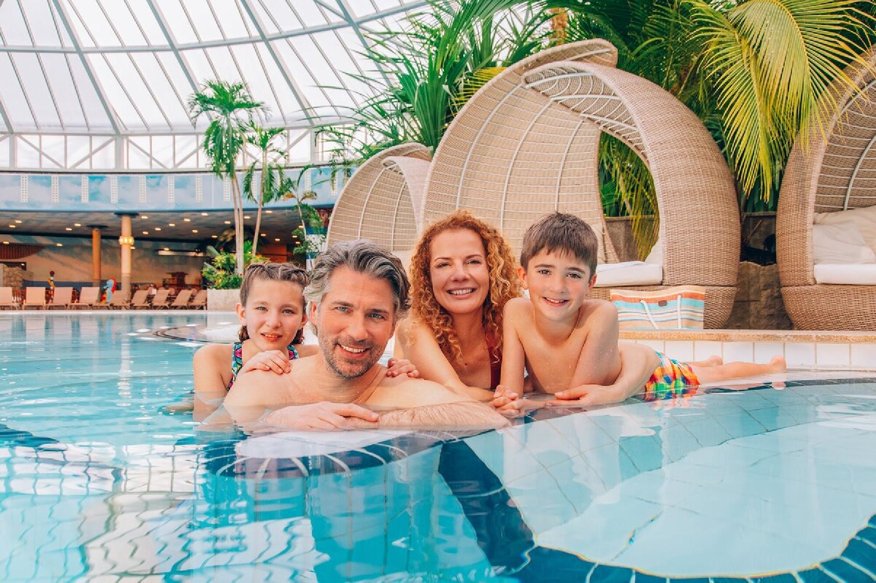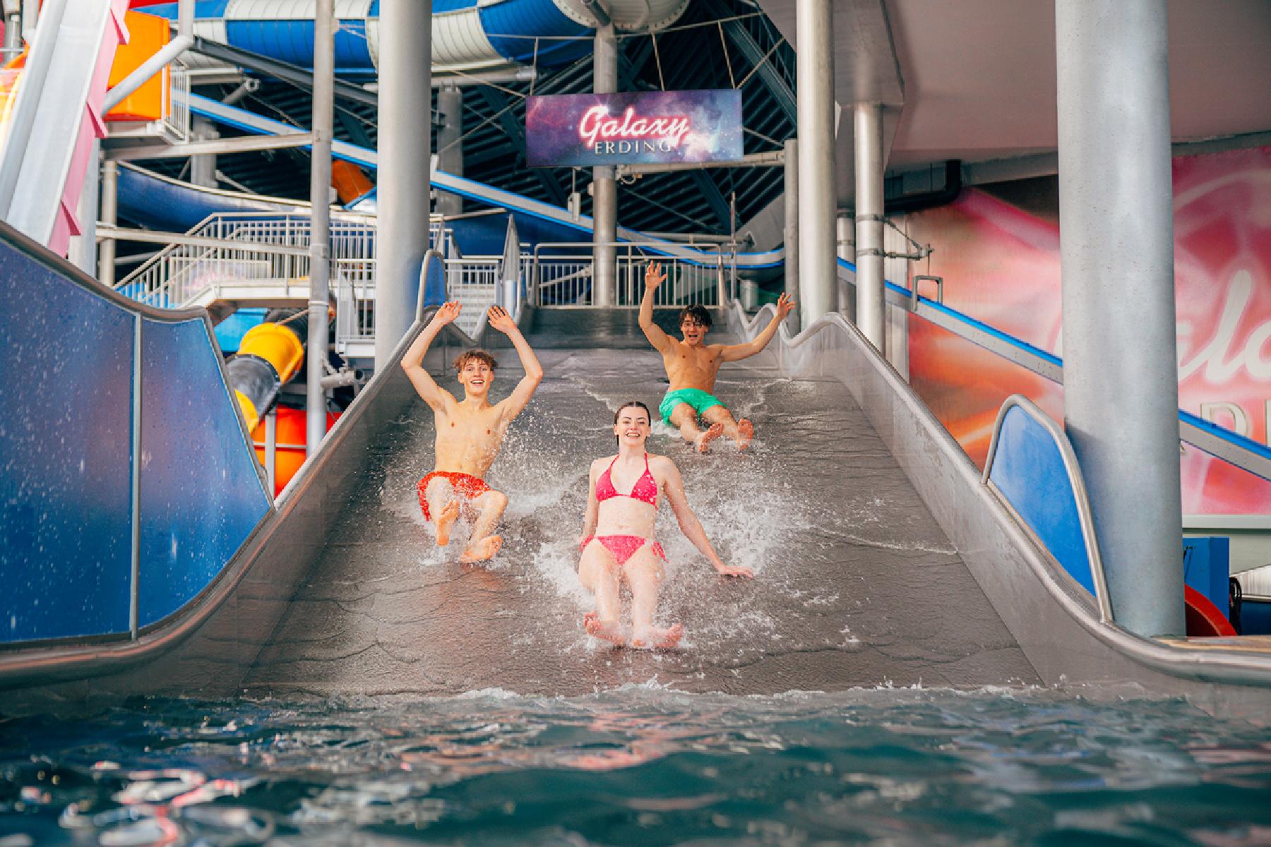 In der tropischen Therme lässt sich Wellness mit der ganzen Familie zelebrieren. Europas größte Rutschenwelt, das Galaxy Erding, verspricht jede Menge Action auf 28 spektakulären Rutschbahnen. Im Indoor-Bereich erwartet die Besucher ein neues Highlight: die 130 m lange Indoor-Reifenrutsche „Big Bang“! Das Urlaubsglück wird durch ein Bad im türkisglitzernden Wellenbad abgerundet. Sich auf Poolnudeln treiben lassen und inmitten grüner Großpalmen von fernen Reisen träumen – so fühlt sich Urlaub an.